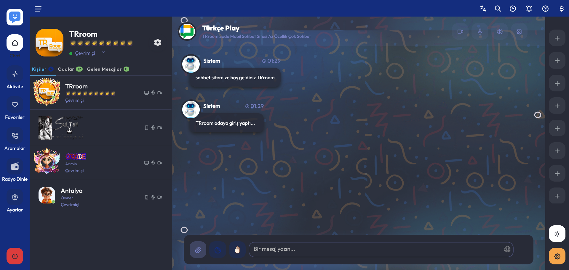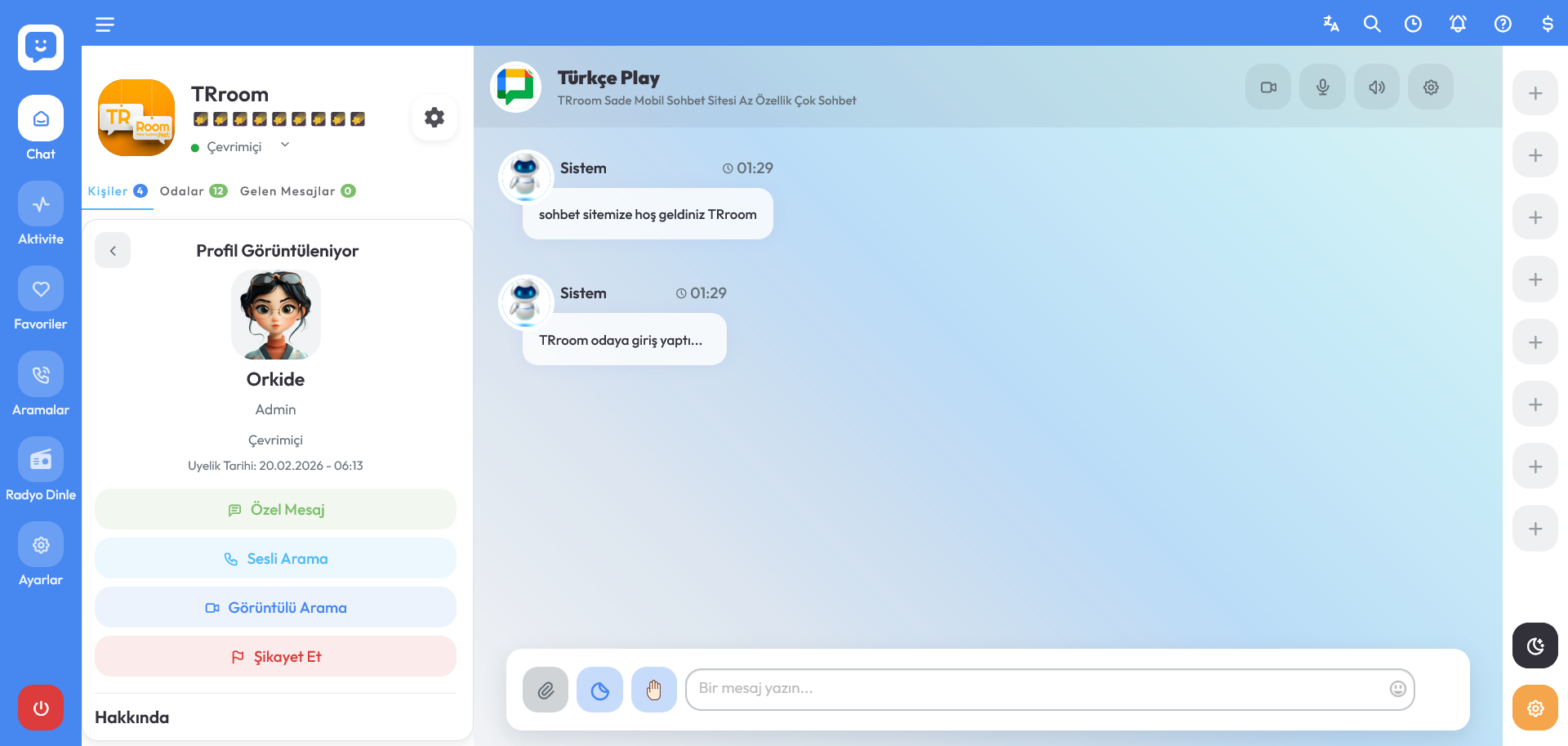 TRROOM.NET, dijital iletişim alanında yenilikçi ve güvenilir sohbet çözümleri sunan profesyonel bir platformdur. Sohbet odası kiralama ve arkadaşlık sohbet sitesi hizmetlerinde, kullanıcı dostu altyapısı ve güçlü teknik yapısıyla sektörde fark yaratır. Yüksek performanslı sistemleri, kesintisiz hizmet anlayışı ve uzman teknik desteğiyle, bireysel ve kurumsal müşterilerine güvenilir ve sürdürülebilir çözümler sunar.