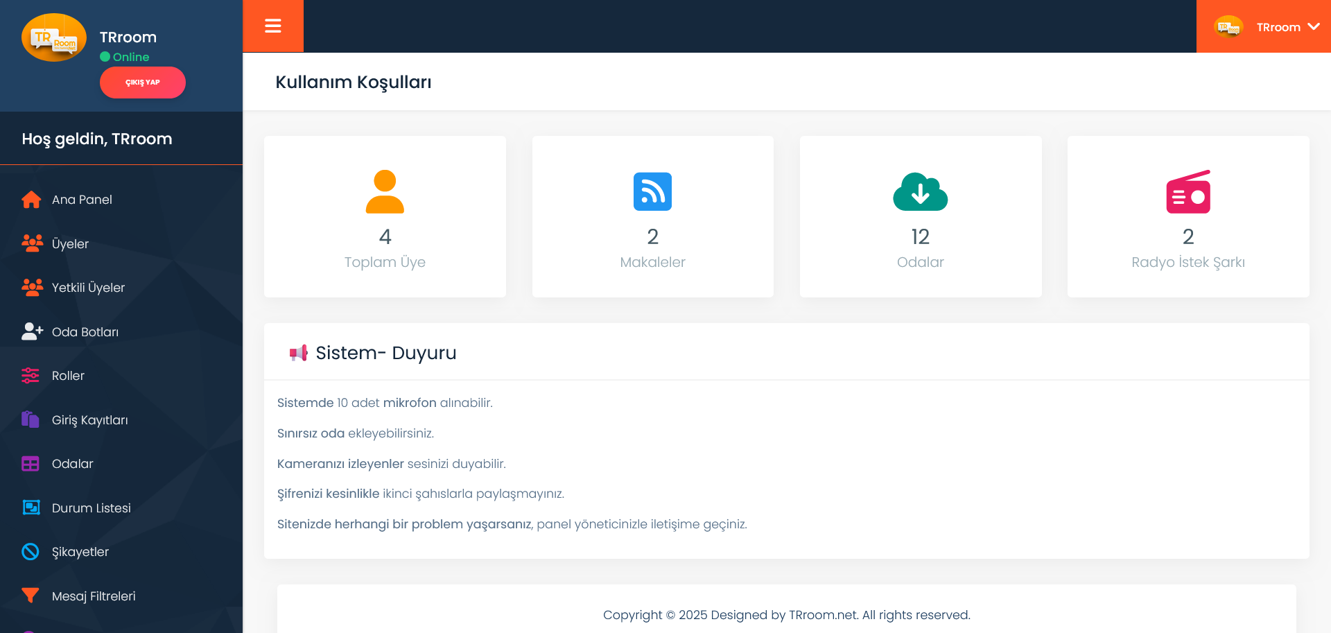 TRroom.net, yalnızca bir yazılım sağlayıcısı değil; dijital iletişim projelerinizde uzun vadeli bir çözüm ortağıdır. Kaliteli hizmet anlayışımız, müşteri memnuniyeti odaklı yaklaşımımız ve sürekli gelişen altyapımızla, online sohbet sektöründe güvenilir bir marka olmayı sürdürmekteyiz.